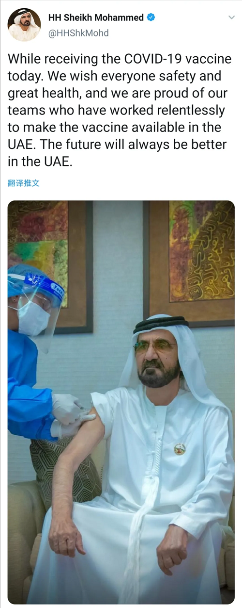 11月3日,阿拉伯聯(lián)合酋長國副總統(tǒng)兼總理、迪拜酋長阿勒馬克圖姆在社交媒體分享了自己正在接種國藥集團(tuán)中國生物新冠疫苗的照片,并表示:“在我接種疫苗時(shí)我希望所有人安全、健康。我們非常感謝我們的團(tuán)隊(duì),正是他們沒日沒夜地工作使得阿聯(lián)酋得以接種新冠疫苗。阿聯(lián)酋的未來更美好。”