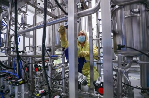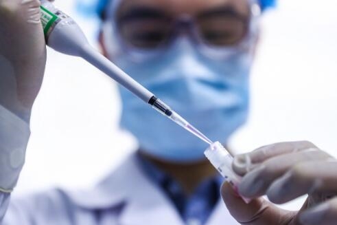 4月11日,工作人員在國(guó)藥集團(tuán)中國(guó)生物新冠疫苗生產(chǎn)基地質(zhì)量檢定部門對(duì)新型冠狀病毒滅活疫苗樣品進(jìn)行檢測(cè)。