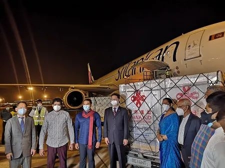 2021年5月25日子夜,在斯里蘭卡正面臨新一波新冠疫情嚴(yán)峻沖擊之際,中國政府再次援斯的50萬劑國藥疫苗順利運抵科倫坡班達(dá)拉奈克國際機場。斯衛(wèi)生部長瓦尼拉奇和中國駐斯大使戚振宏一道,與斯青年和體育部長納馬爾、民航和旅游部長拉納通加、制藥國務(wù)部長賈亞蘇馬納、總統(tǒng)首席顧問維拉通加、外交部常秘科倫貝格等十余位政府高官等共同在機場迎接,并出席疫苗交接儀式。中國駐斯使館經(jīng)商參贊李光軍、政治處主任羅沖同行。