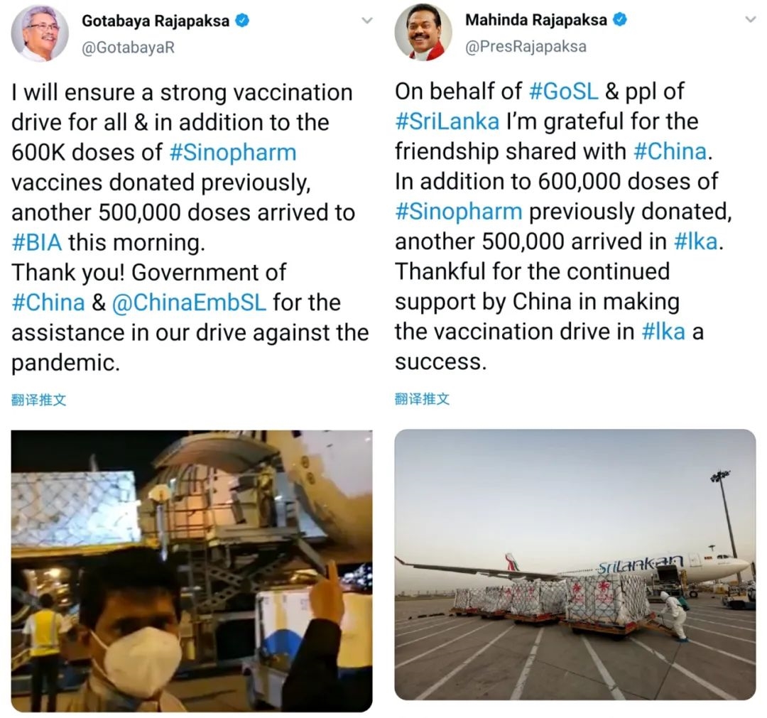 5月26日一早,戈塔巴雅總統(tǒng)、馬欣達(dá)總理分別在社交媒體個人賬戶上發(fā)文,衷心感謝中國政府繼續(xù)雪中送炭,幫助斯里蘭卡抗擊新一波疫情。